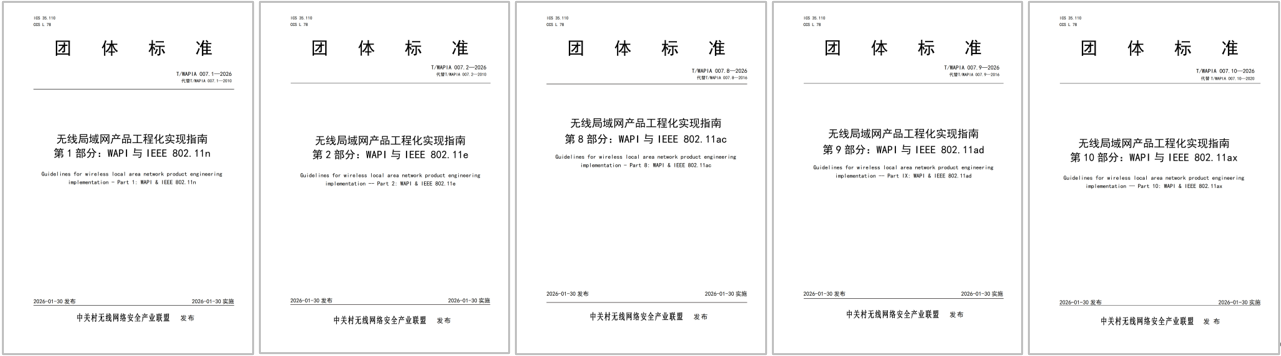 本次修订的五项团体标准,全面覆盖基础安全与主流高速率通信融合技术领域,具体包括:T/WAPIA 007.1—2026《无线局域网产品工程化实现指南 第1部分:WAPI与IEEE 802.11n》、T/WAPIA 007.2—2026《无线局域网产品工程化实现指南第2部分:WAPI与IEEE 802.11e》、T/WAPIA 007.8—2026《无线局域网产品工程化实现指南第8部分:WAPI与IEEE 802.11ac》、T/WAPIA 007.9—2026《无线局域网产品工程化实现指南第9部分:WAPI与IEEE 802.11ad》、T/WAPIA 007.10—2026《无线局域网产品工程化实现指南第10部分:WAPI与IEEE 802.11ax》。