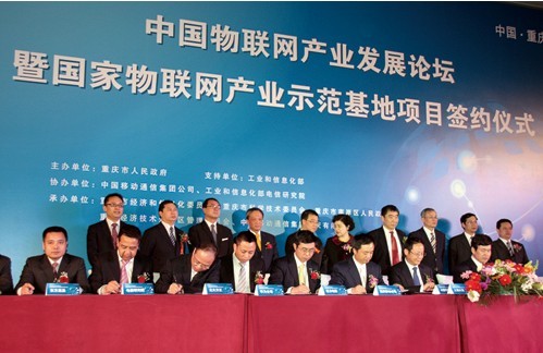当天,重庆市南岸区正式获得国家工信部授牌,成为“国家物联网产业示范基地”。重庆市政府与中国移动通信集团公司签订了“创新物联网应用——共建云端智能重庆”战略合作协议,标志着集硬件、软件研发、制造、营运和中介服务为一体的、以技术实现商用化的完整的物联网产业链模式浮出水面。